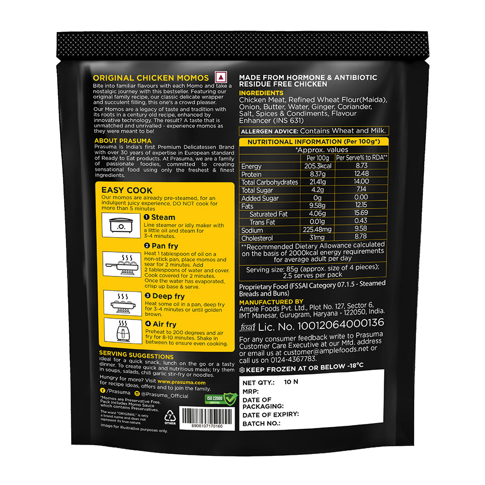Experience the authentic taste of Himalayan-style chicken momos at home with Prasuma Chicken Momos. Prepared using tender chicken, carefully seasoned, and encased in soft, thin dough, these momos offer restaurant-quality flavor in every bite.
