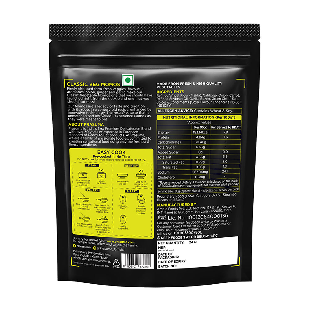 Enjoy the comfort of authentic Himalayan-style veg momos at home with Prasuma Classic Veg Momos. Made using fresh vegetables, delicately seasoned and wrapped in soft, thin dough, these momos deliver restaurant-quality taste in every bite.